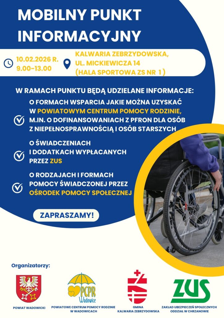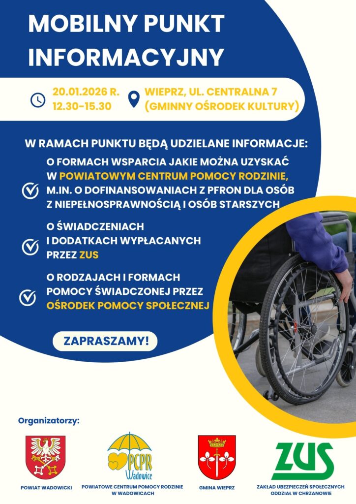 20 stycznia 2026r. zapraszamy mieszkańców gmin Tomice i Wieprz na spotkanie informacyjne. Pracownicy Powiatowego Centrum Pomocy Rodzinie w Wadowicach, Zakładu Ubezpieczeń Społecznych oraz Ośrodka Pomocy Społecznej będą udzielać porad dotyczących dostępnych form pomocy dla osób starszych, chorych i z niepełnosprawnością świadczonych przez te instytucje.