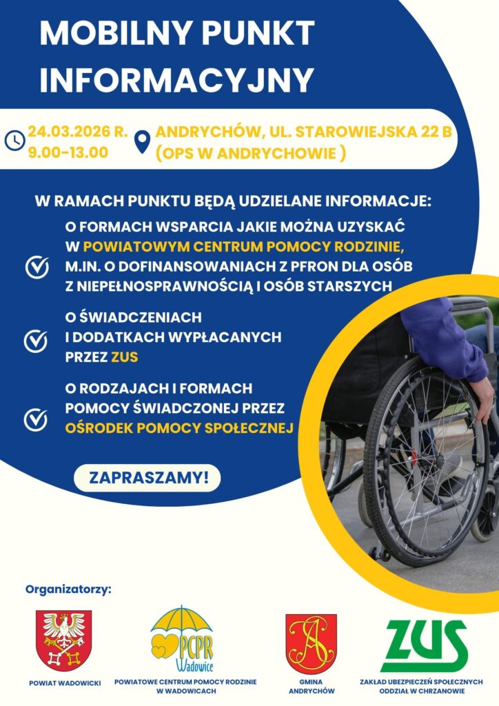24 marca br. zapraszamy mieszkańców gminy Andrychów na spotkanie informacyjne. Pracownicy Powiatowego Centrum Pomocy Rodzinie w Wadowicach, Zakładu Ubezpieczeń Społecznych oraz Ośrodka Pomocy Społecznej będą udzielać porad dotyczących dostępnych form pomocy dla osób starszych, chorych i z niepełnosprawnością świadczonych przez te instytucje.
